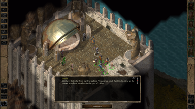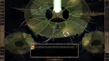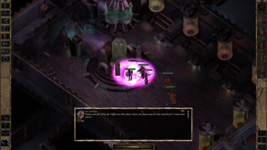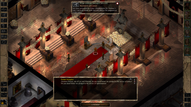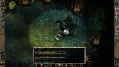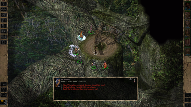 - 在資料片《邪神霸權》裡被主角肉身復活的一代魔頭 Sarevok,有機會在加入冒險隊伍後由邪轉正,但相關對話卻可能始終沒有觸發。對此,解決方案是讓主角跟 Sarevok 獨處,然後 Ctrl + I 按著不放,強制遊戲開始運算人物互動序列,直到觸發對話為止。然後就這樣反覆觸發幾次,倘若都有做出一系列適當的對話選擇,最後 Sarevok 將會從混沌邪惡(Chaotic Evil)轉變為混沌善良(Chaotic Good)。