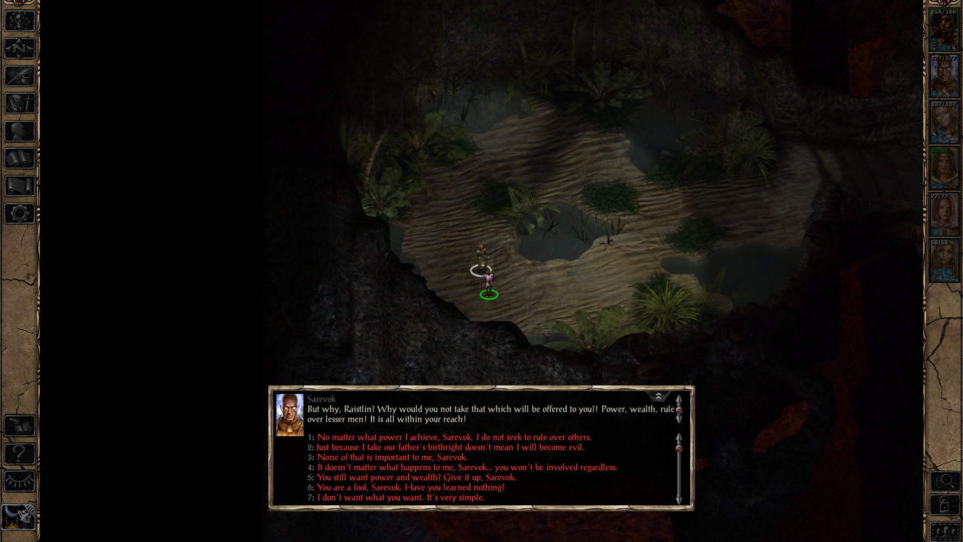 然而說到夥伴對話,不得不說《柏德之門 II》導入的戀愛養成機制,也就是主角能夠跟某些異性夥伴發展戀愛關係,它在遊戲中的實作方式,DR 真心覺得是個影響遊戲體驗的干擾源……NPC 夥伴經常會在遊戲初期,各種莫名其妙的時刻觸發相關對話,還有勾心吃醋的,讓人覺得危難當前,這些人是吃飽太閒嗎……?後來索性立場明確,不要做出選擇,大家通通做好朋友,才有所止息。