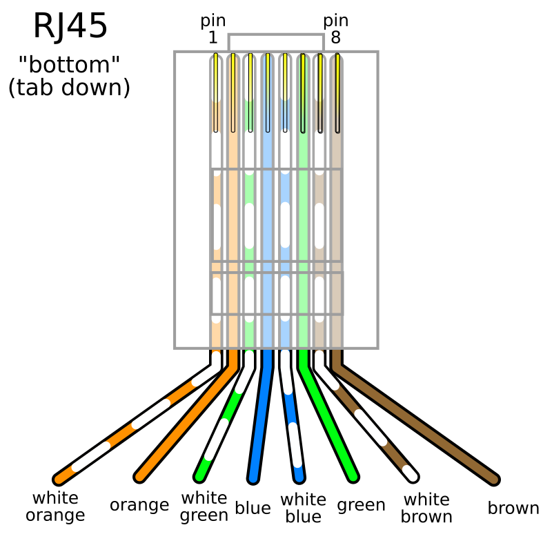 - 再次確認保護套是否已先套入,接著水晶頭翻至有接腳那面,洞口朝自己,然後將芯線按先前排序,整排插入到底。前後左右檢查每條芯線是否都有插到底。常見事故是有芯線卡在中途,沒有插到底,屆時壓接時就會壓不到線。