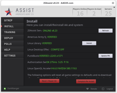 完成安裝步驟後,使用者家目錄下應該會另外存在一個名為 25Assist 的目錄,用於放置《美國陸軍》的遊戲檔案。不過前一步驟的 25Assist-Linux 目錄也依然需要,因為其中的安裝程式 25Assist 同時也是遊戲的輔助啟動程式,所以一樣是透過它來執行遊戲。雖然遊戲本身的執行檔也是能夠被直接執行的,例如以下指令: